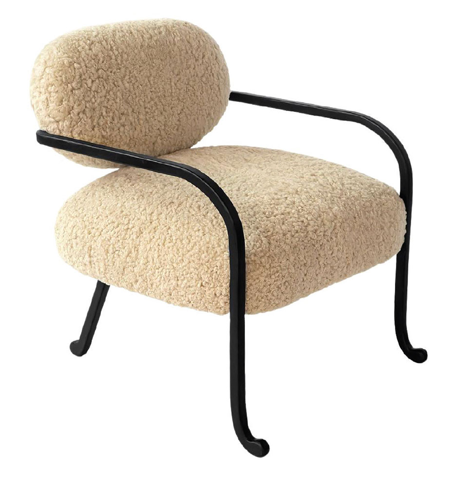 Indulge in whimsical luxury with this head-turning elegant armchair, resembling a fluffy sheep. Hand-carved iron legs and arms combine with a plush shearling seat and back to create a modern classic.