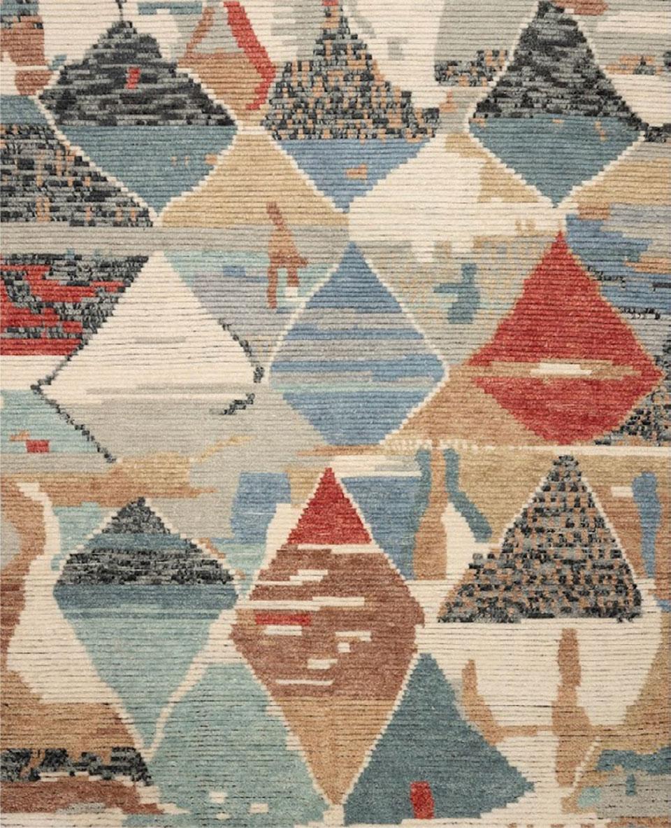This contemporary influenced Moroccan style rug features a blend of traditional Moroccan design elements with modern aesthetics. The summery color palette, in blues and oranges, evokes a sense of coolness and tranquility, reminiscent of clear summer skies and refreshing waters. Available at AZADI Fine Rugs in a variety of sizes. Please call for details.